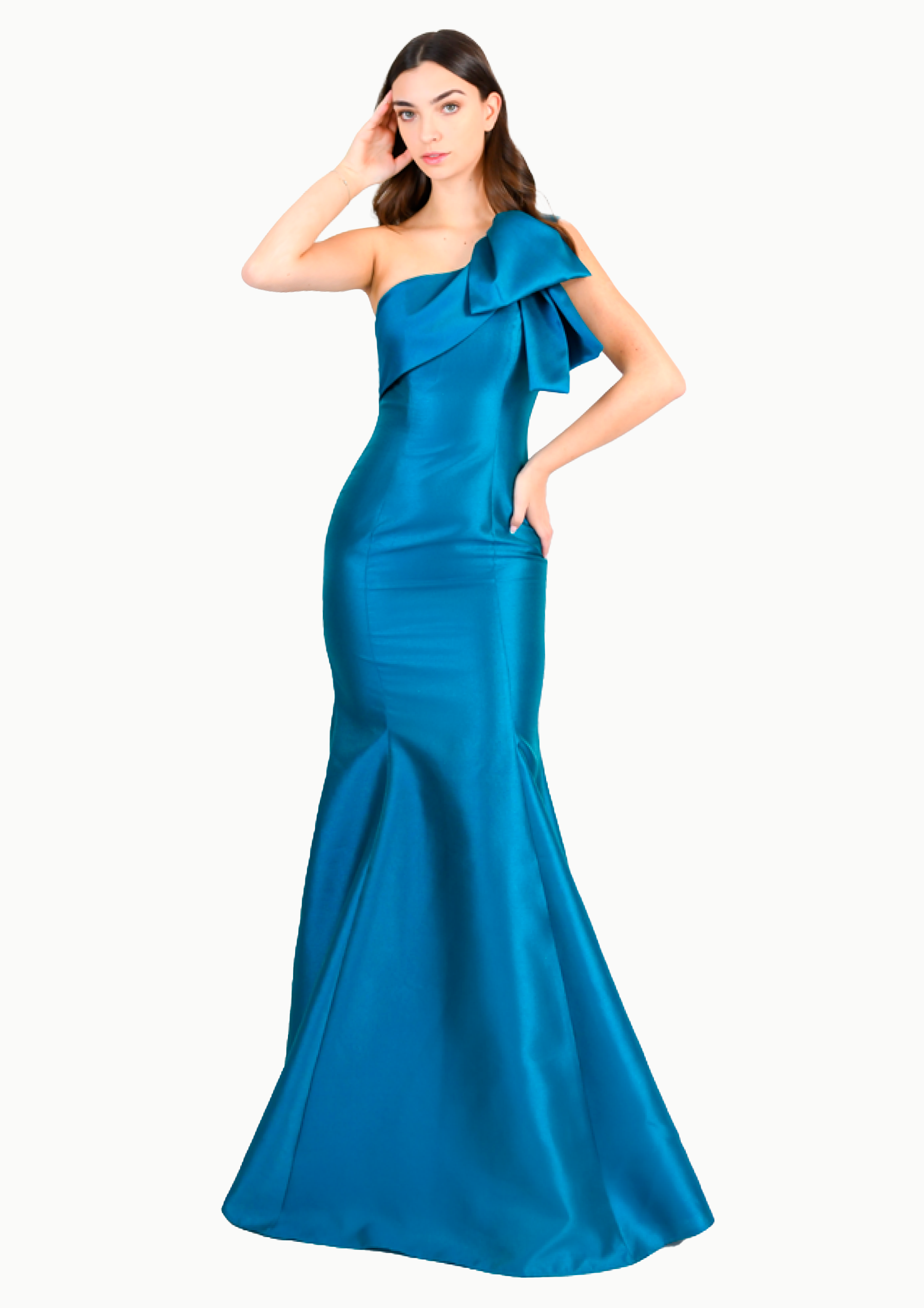 Vestido de hombro asimétrico con diseño de moño y falda en corte sirena.
