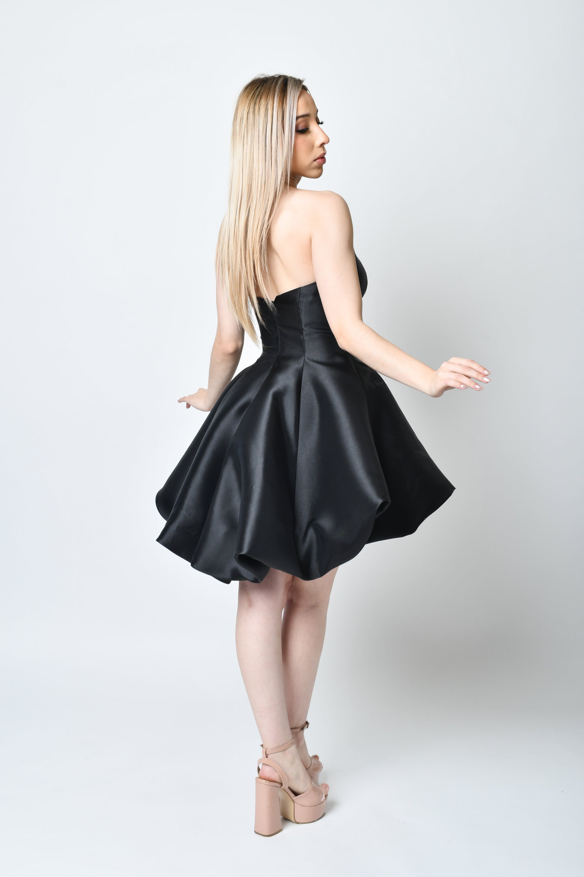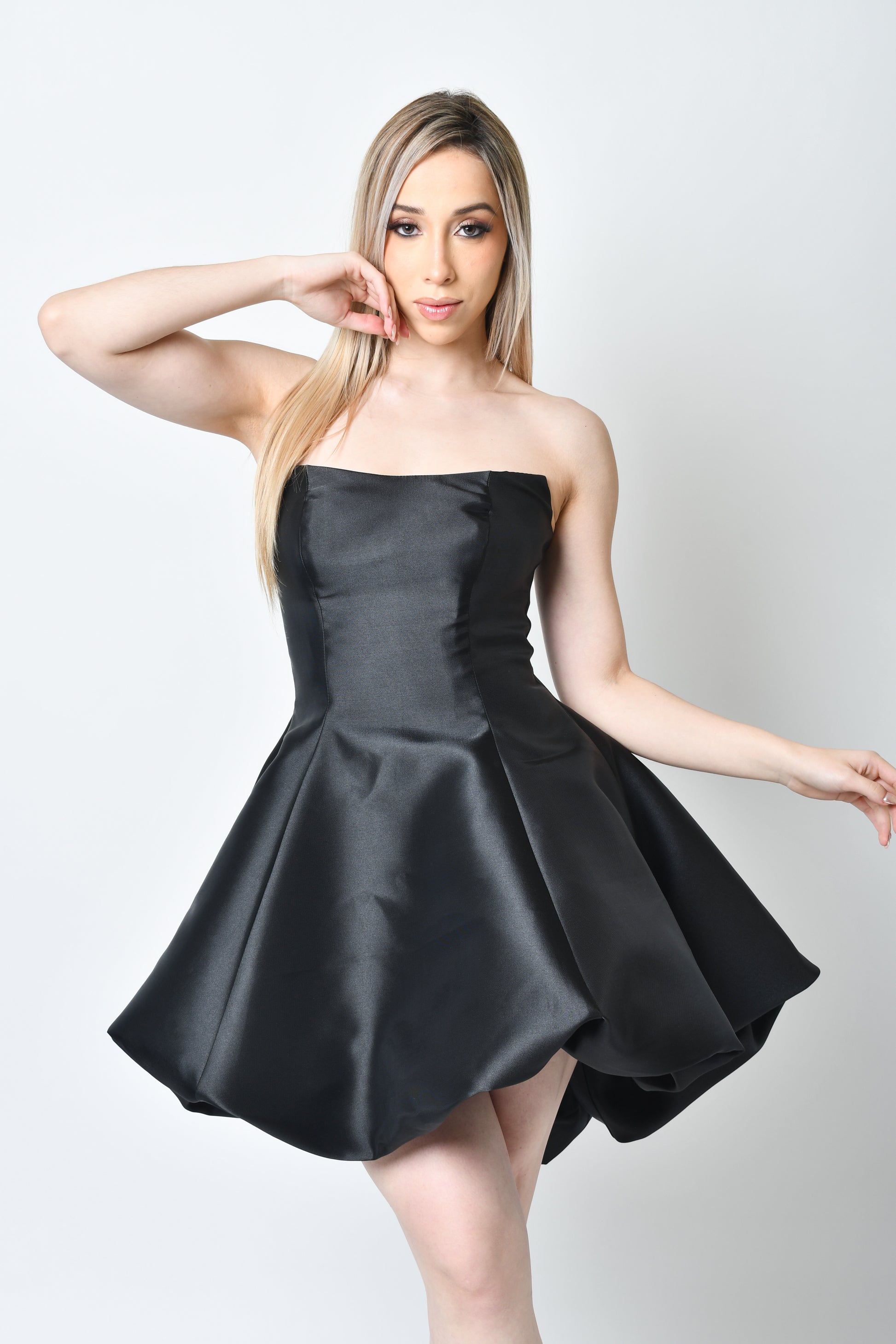 VESTIDO CORTO STRAPLESS DE FALDA GLOBO