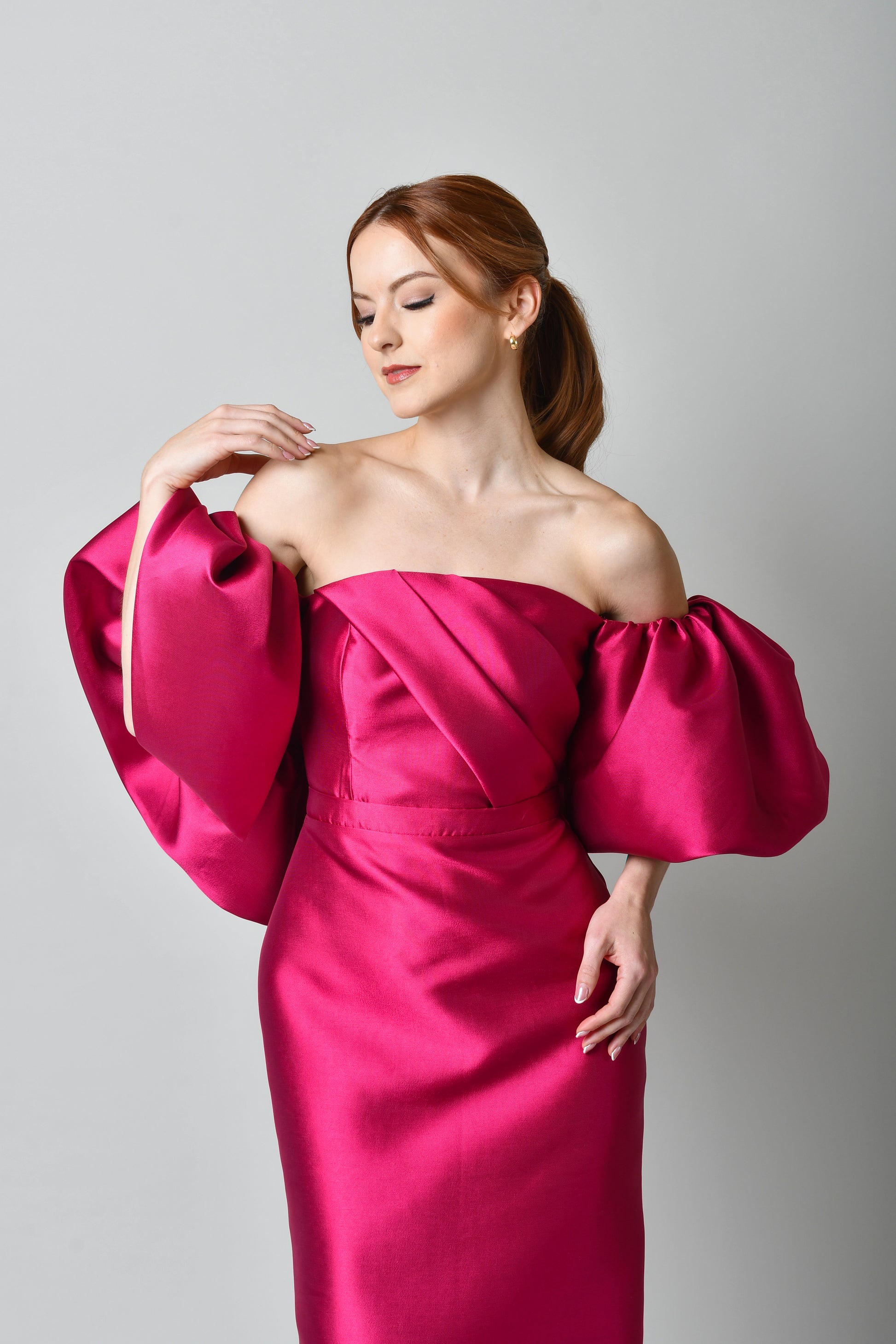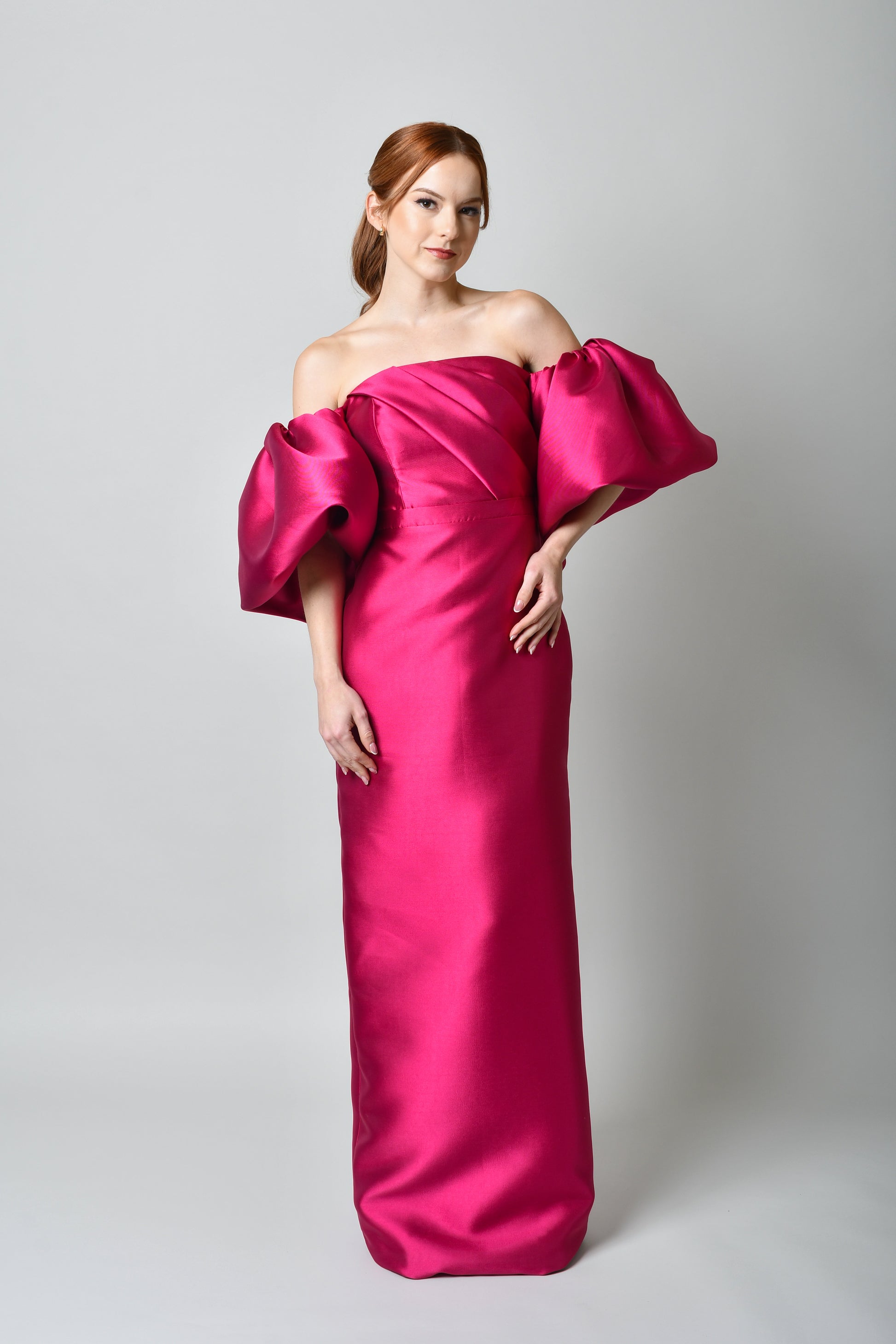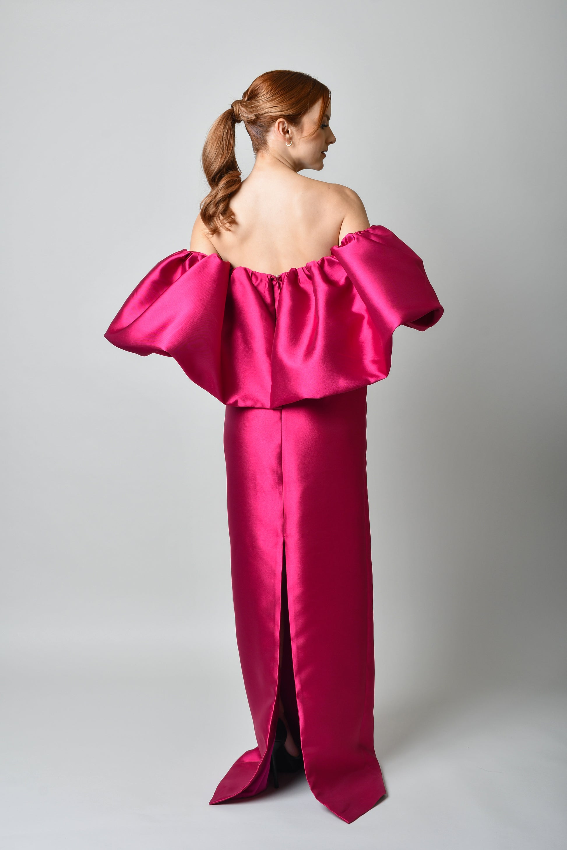 VESTIDO LARGO SIN HOMBROS CON OLAN DE GLOBO Y FALDA RECTA