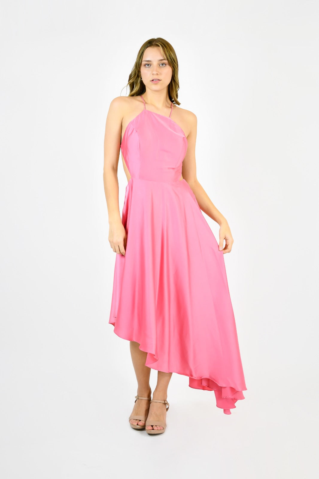 Vestido asimétrico con escote trapecio y espalda escotada.